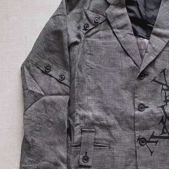 This Self-made Yohji Yamamoto wool blend trench features a classic houndstooth pattern enhanced by the signature 'Y' monogram print, symbolizing refined craftsmanship. Constructed with premium materials, it offers superior warmth and durability while maintaining a sleek, tailored fit. An exemplary piece that merges traditional elegance with contemporary design, ideal for those seeking sophisticated and enduring outerwear.